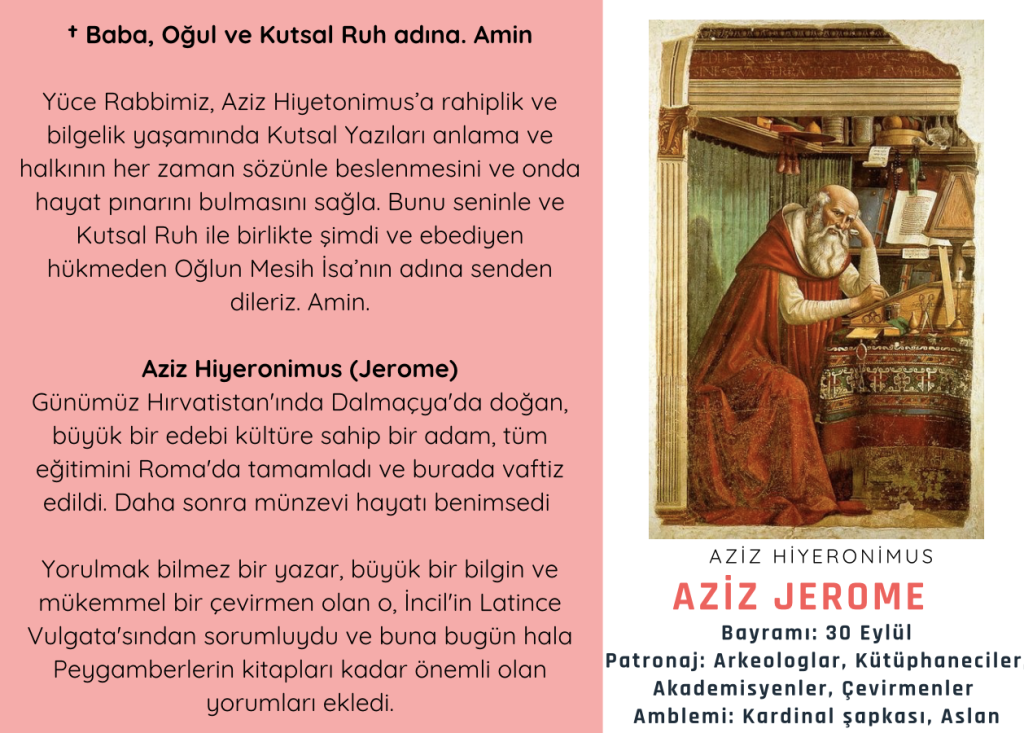 Günümüz Hırvatistan’ında 345 yılı civarında doğduğu sanılan Aziz Hiyeronimus, Antakya yakınlarında inzivaya çekilir. Bu dönemde yoğun bir şekilde okur ve ağır bir çile yaşamı sürdürür.