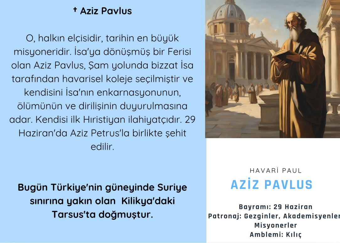 Aziz Pavlus (Saul) şüphesiz tüm zamanların en büyük misyoneridir. İsa’yı kişisel olarak tanımıyordu, ancak Şam yolundaki göz kamaştırıcı çağrısı sayesinde onun en büyük müritlerinden biri oldu. Din değiştirmiş paganların davasını savundu, havariydi. Petrus ile birlikte o zamanın Akdeniz dünyasında Evanjelik mesajı yaydı; sözleri ve yazılarıyla İncil’in tarihteki ilk ve temel kültürleşmesini sağlamıştır.