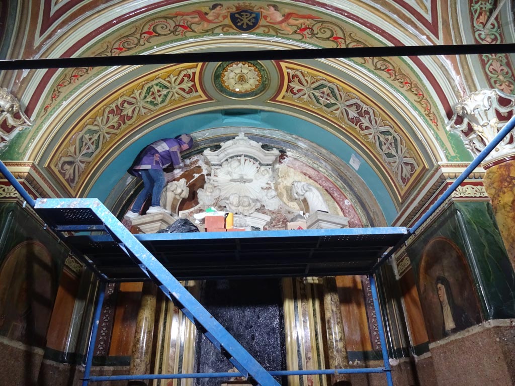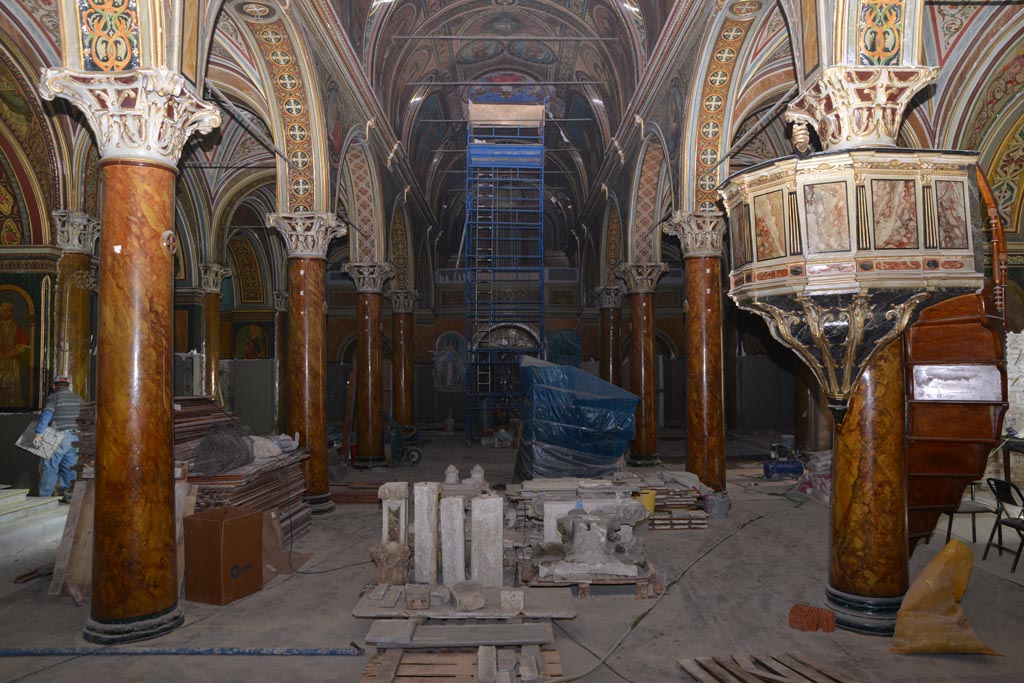 Son restorasyonlardan birinde sunaklar ve heykeller de dahil olmak üzere tüm kilise boyanmıştı. Bu malzemelerin soyulmasını önlediyse de duvarların nefes almasını önledi, şimdi bu boya kararmış durumdadır. Son depremde eski çatlaklar da açıldı. Geçtiğimiz yıl kilisenin tüm mobilyaları depoya kaldırıldı. Eski elektrik sistemi söküldü ve yeni bir proje hazırlandı.. Duvarların alt kısmındaki tüm ahşap kaplamalar ve terrazzo kaplamalar kaldırıldı. Ana sunak da dahil olmak üzere yedi sunaktaki lake kaplamalar kaldırıldı, ancak ileride daha fazla restorasyon çalışması yapma gereği bulunmaktadır.Ana sunak (alt bölümü barok) çok gevşekti ve bir kaç kez taşındı ve tamir gördü, ancak tam bir restorasyonla yeniden birleştirilmesi öngörüldü. Söküm işlemi Gnom şirketi tarafından hediye olarak gerçekleştirilmiştir. Tahribatsız yöntemler kullanılarak yapılan araştırmalara ek olarak, kilisenin dışındaki ve içindeki duvarlarda çok sayıda sondaj yapılmıştır. Bugüne kadar yapılan incelemeler, kilisenin 17. yüzyılın başlarındaki orijinal tasarımını koruduğunu, Raymond Péré’nin 19. yüzyılın sonlarına ait freskinin bulunduğu son katmanın her yerde mevcut olduğunu ve iyi korunduğunu, ancak çok sayıda rötuş ve vernikleme yapıldığını göstermiştir.